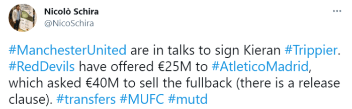 曼联正在与马竞就特里皮尔转会谈判,红魔给出了2500万欧元的报价,但是马竞的要价是4000万欧元,与特里皮尔的解约金数额相同。