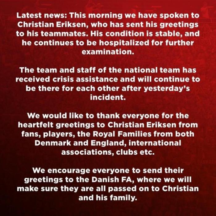 我们衷心感谢来自球迷、球员、俱乐部、协会以及丹麦和英格兰皇室对埃里克森的关心和问候。