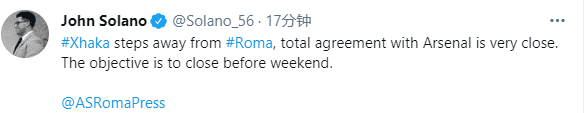 索拉诺称扎卡距离罗马一步之遥,阿森纳和罗马已经非常接近完全达成一致。扎卡有望在周末加盟红狼。枪手方面记者克里斯-惠特利称,扎卡的转会费为2000万欧。