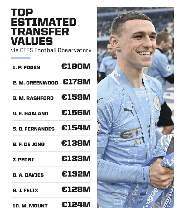 CIES评球员身价:福登榜首,曼联双星位列二三!姆巴佩未进前十!