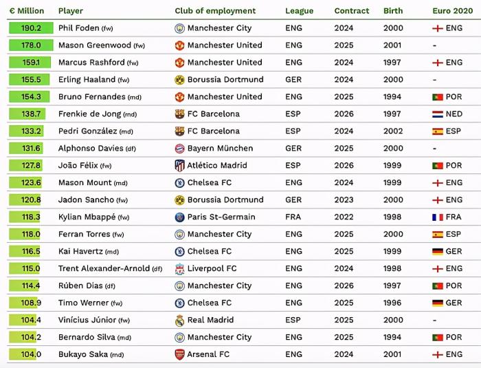 曼城的英格兰国脚福登以1.902亿欧元的估值高居第一,曼联的格林伍德1.78亿欧元屈居第二,而拉什福德则以1.591亿欧元排在第三。