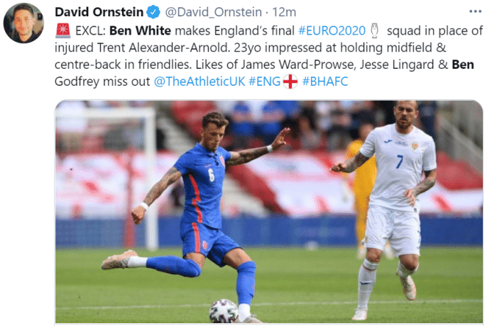 阿诺德在此前英格兰的友谊赛中受伤,并因此错过了欧洲杯,奥恩斯坦表示,索斯盖特将召入本-怀特,这意味着沃德-普劳斯、林加德和戈弗雷都将无缘本届欧洲杯。