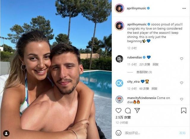 24直播网讯北京时间昨天,曼城后卫鲁本-迪亚斯当选本赛季英超最佳球员,今天他的女友艾维在ins上表达了对老公的祝贺。