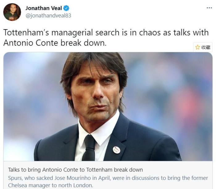 24直播网讯 据热刺跟队记者JonathanVeal报道,热刺与孔蒂的谈判已经破裂。