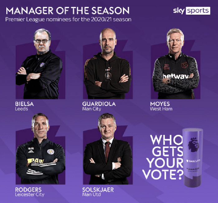最佳主帅方面,曼城主帅瓜迪奥拉、曼联主帅索尔斯克亚、莱斯特城主帅罗杰斯、西汉姆主帅莫耶斯和利兹联主帅贝尔萨进入了最终的五人候选名单。这五名主帅,本赛季的表现都非常出色,瓜迪奥拉带队拿到了英超冠军,而索尔斯克亚带队拿到了亚军,莱斯特城斩获英超第五,而西汉姆和利兹联的表现都非常出色,可以说他们都有机会获奖。
