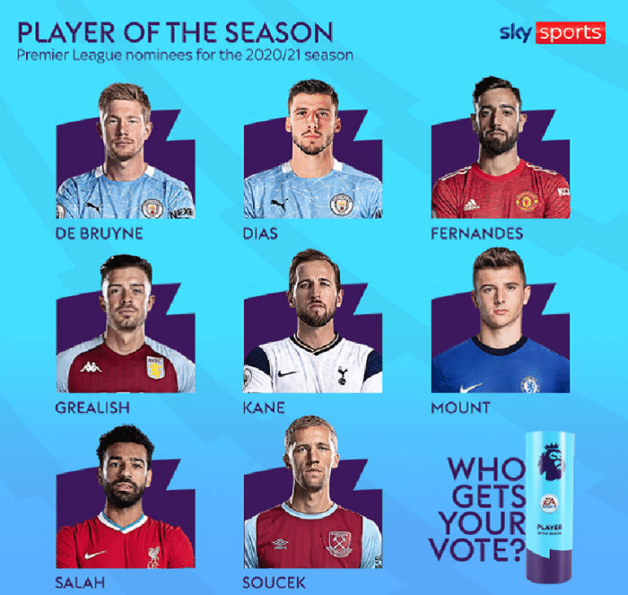 球员方面的8个候选人分别是曼城的迪亚斯和德布劳内,曼联的B费,维拉的格拉利什,热刺的凯恩,切尔西的芒特,利物浦的萨拉赫和西汉姆的索切克。这个阵容中的球员都是本赛季表现出色的球员,不过遗憾的是林皇无缘入选。其中,迪亚斯和德布劳内帮助曼城拿到冠军,B费是曼联绝对的核心,格拉利什表现出色,凯恩更是踢出职业生涯最佳赛季,而芒特比上赛季更进一步,萨拉赫依然文件,索切克可以说是西汉姆的绝对核心。
