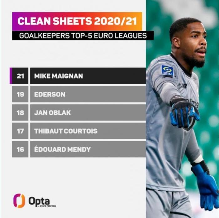 24直播网讯 近日,据Opta数据统计,在欧洲五大联赛的门将零封榜中,里尔门将麦尼昂以21次零封居首,埃德森、奥布拉克、库尔图瓦、门迪上榜。