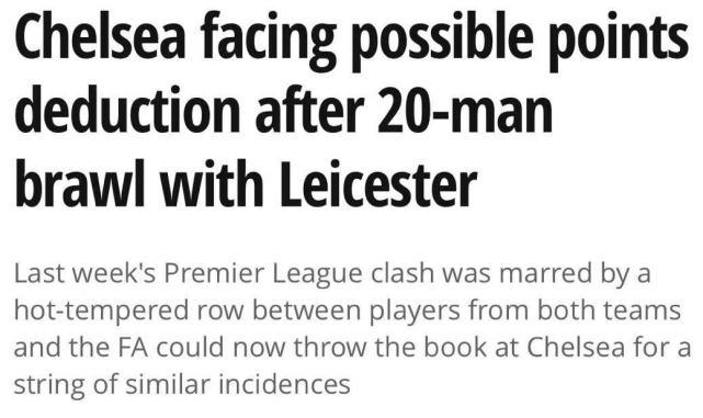 《每日镜报》透露,相比于同样参与混战而受到指控的莱斯特城,切尔西的纪律问题更为糟糕,这是他们7年来第7次因球场纪律问题被指控。早在2016年,切尔西就曾因为与热刺的大规模冲突而险些被扣分,那次冲突最终让蓝军被处以37.5万英镑的罚款。此后蓝军又被指控两次,但都逃过了处罚。