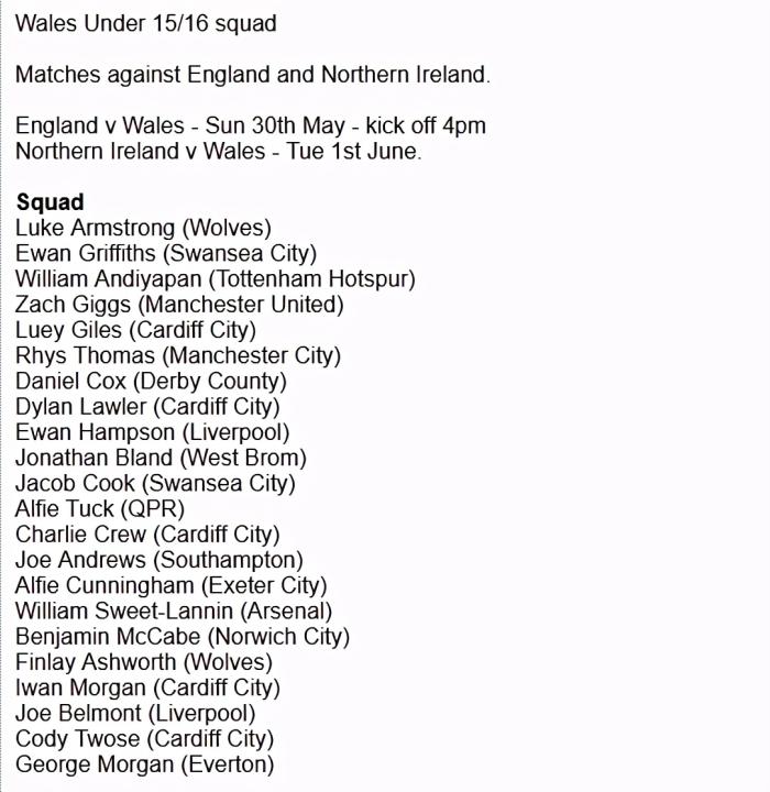 现年14岁的扎克·吉格斯,进入了威尔士U16代表队的22人大名单,该队5月30日将对阵英格兰队,随后则将对阵北爱尔兰队。有趣的是,扎克的位置与父亲完全不同,他不是边锋,不是中前场球员,而是一名后卫。资料显示,扎克能打中卫或者边卫。