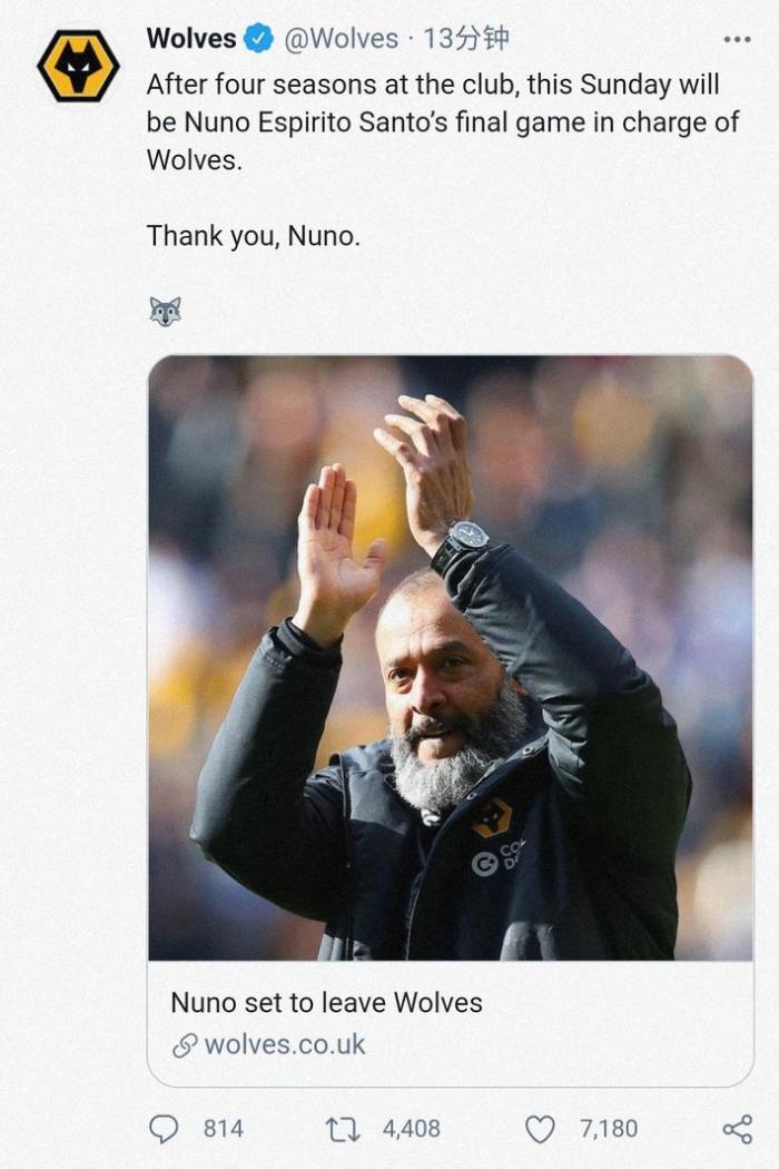 24直播网讯 努诺此前曾执教过瓦伦西亚、波尔图等俱乐部。2017年7月1日担任狼队主教练,在此期间,努诺率队重返英超,并取得了英超第七的好成绩。