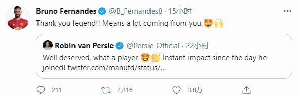 布鲁诺-费尔南德斯随后也在推特上回应了范佩西的表扬:“感谢传奇!您的赞扬对我来说意义重大!”