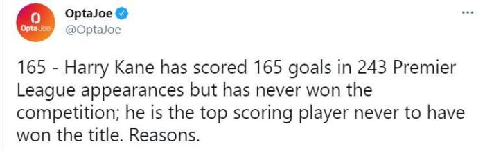 24直播网讯 据知名数据网站opta统计,热刺前锋凯恩目前已经打进165粒英超进球,是英超未夺冠球员中进球最多的。