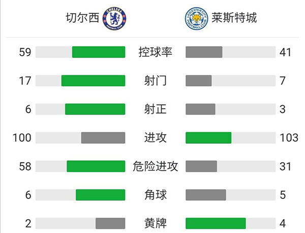 全场比赛结束,切尔西主场2-1战胜莱斯特城。