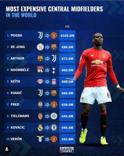24直播网讯 北京时间5月15日,德转列出了足坛中前卫转会费的排行榜,博格巴1.05亿欧高居榜首,贝隆入选。