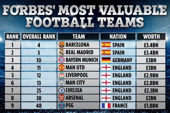 在世界足坛,西甲双雄巴萨和皇马价值高手首位,都在34亿英镑左右,所有运动中仅次于美式足球的达拉斯牛仔(40亿镑)、纽约扬基棒球队(37亿镑)和纽约尼克斯(35亿镑),排在第四和第五位。