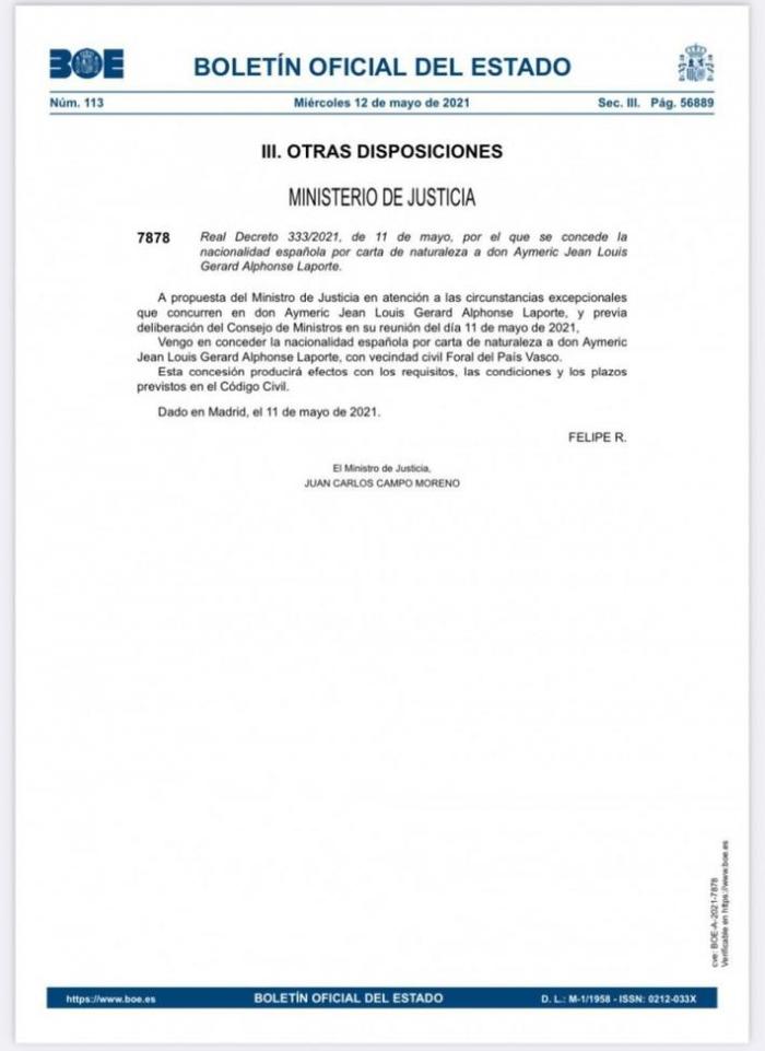 西班牙司法部宣布,根据2021年5月11日第333号法令,艾梅里克-让-路易-赫拉德-拉波尔特被正式授予西班牙国籍。他只代表过法国青年队比赛,因此有资格代表西班牙成年队征战今夏的欧洲杯。