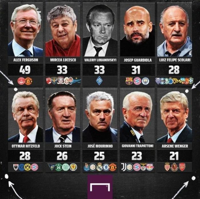 24直播网讯进球网统计主教练冠军数,弗格森49冠高居榜首,瓜迪奥拉31冠排第四,穆里尼奥25冠第八,温格21冠第十。