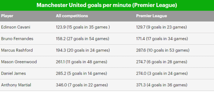 数据显示,卡瓦尼是全曼联进球效率最高的球员。各项赛事他35场打入15球,平均123.9分钟攻入一球,在英超则是23场9球,129.7分钟进一球,两项数据均为全队第一。头号射手布鲁诺·费尔南德斯也望尘莫及,葡萄牙新核各项赛事158.2分钟进一球,英超则是171.4分钟一球。而且,费尔南德斯是点球手,而卡瓦尼的进球,全都是运动战得分。
