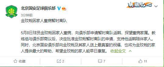 北京国安官方:金玟哉因家人重病暂时离队