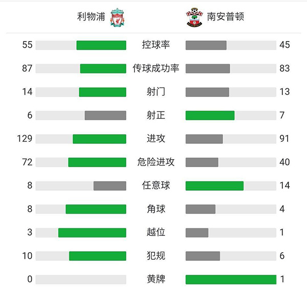全场比赛结束,凭借马内和蒂亚戈的进球,利物浦2:0战胜南安普顿,积分进入前6。