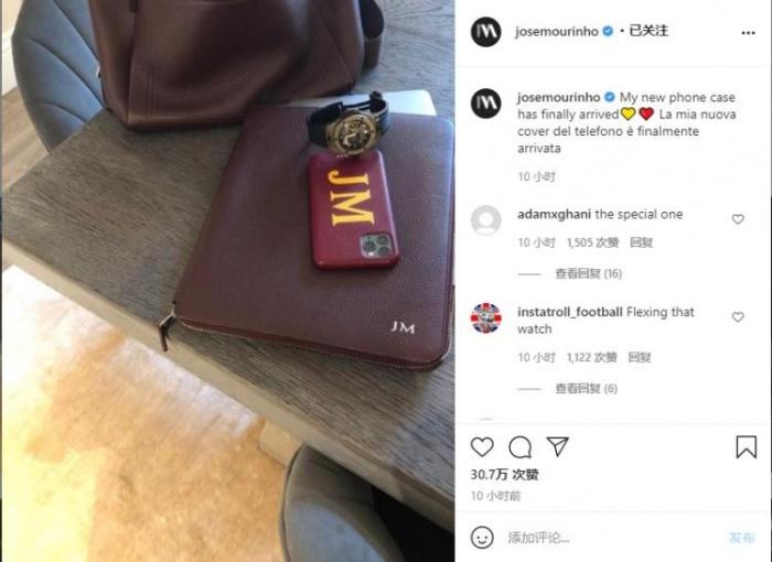 穆里尼奥配文道:“我的新手机壳终于到手了”并配上了黄色和红色的两个爱心。