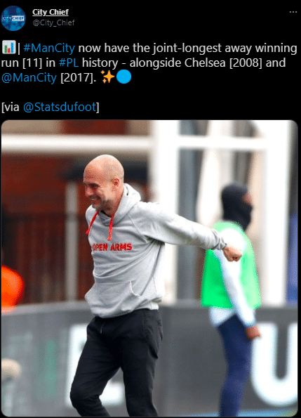 24直播网讯北京时间5月2日,英超第34轮,曼城客场2-0击败水晶宫,取得英超联赛客场的11连胜。数据统计,这是曼城最长的客场连胜纪录。而这项纪录,之前是由曼城自身还有切尔西共同保持的。