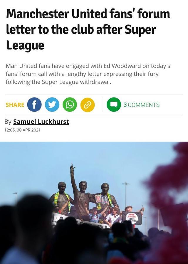 我们对于俱乐部高层筹划组建并加入欧洲超级联赛这一举动感到非常愤怒和羞耻。这件事情反映出了俱乐部的高层和所有者只在乎自己的利益最大化,完全不关注俱乐部球迷的心理诉求和呼声。在和球迷、球员和教练组都没有充分接触的情况下就擅自做出加入欧超联的决定,这绝对是对于俱乐部事务的不当处理,是对所有热爱曼联的人的巨大伤害。