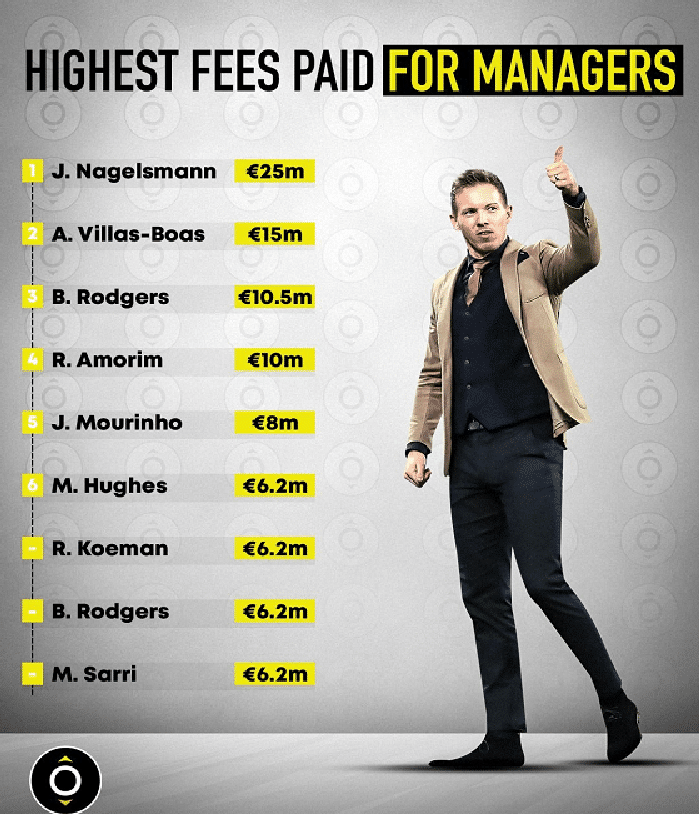 如图,纳格尔斯曼的“转会费”是最高的,拜仁刚刚宣布纳帅成为球队的主帅,而拜仁为此支付给了莱比锡2500万欧元的违约金。当然,这笔交易值不值就不得而知了。而排名第二的是博阿斯,当初切尔西从波尔图挖来博阿斯的时候,支付了1500万欧元的违约金,不过博阿斯的表现并不好。第三的是莱斯特城从凯尔特人挖走罗杰斯,他们支付了1050万欧元的违约金,而罗杰斯绝对是超值的。而且前三似乎都和穆里尼奥有点关系,纳格尔斯曼被称为“新穆里尼奥”,博阿斯和罗杰斯当初都是穆里尼奥的助教哦。