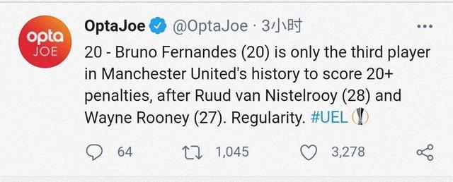 比赛第70分钟,B费点射破门。据Opta统计,这是B费加盟曼联以来为球队打入的第20粒点球。凭借这粒进球,他成为了曼联队史第三位打入超过20粒点球的球员,前两位分别是范尼(28)和鲁尼(27)。