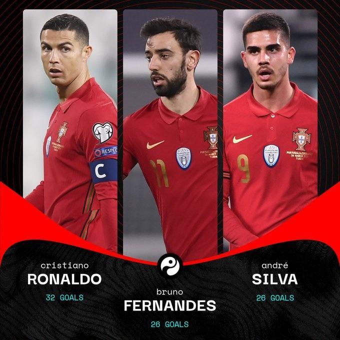 据Squawka统计,C罗、B费和安德烈-席尔瓦三名葡萄牙球星本赛季在俱乐部总计攻入84球。其中C罗39场32球,布鲁诺52场26球,安德烈-席尔瓦31场26球。