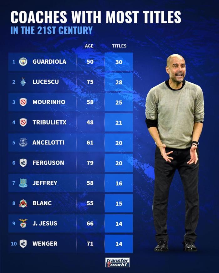 如图,榜首的是曼城主帅瓜迪奥拉,他一共拿到了30个冠军,具体夺冠数据此前发过,大家可以看看去,而且瓜迪奥拉本赛季马上就要拿到第31冠了,而且还有机会拿到第32冠。而排名第二的是谁?是基辅迪纳摩主帅,75岁的老帅卢塞斯库,他在本世纪一共带队拿到了28个冠军,是第二的存在,当然他拿到的冠军的含量可能不如瓜帅。