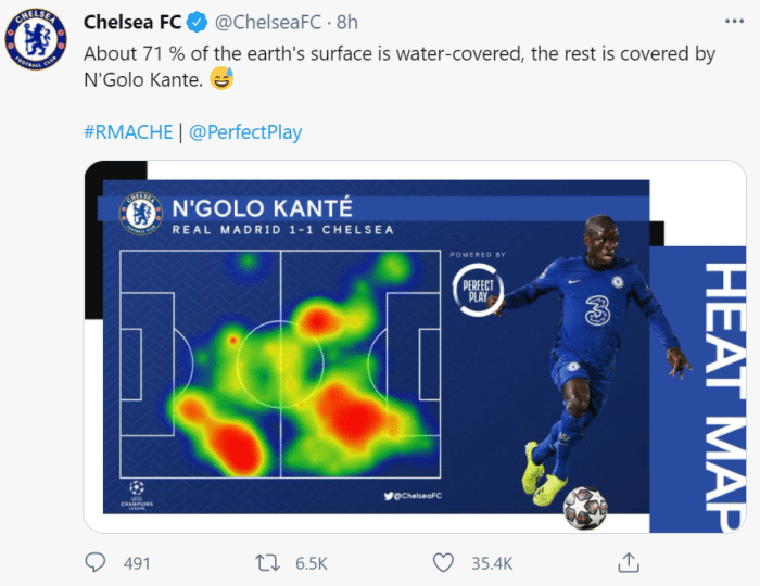 赛后,切尔西官推晒出坎特的赛场热点图,并表示:“地球上大约71%的面积被水覆盖,其余的面积则被坎特覆盖。”