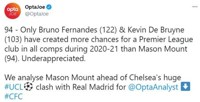 24直播网讯北京时间4月28日,切尔西将在欧冠半决赛中对阵皇马。赛前知名数据网站opta表示,切尔西阵中的芒特是被低谷的球员。