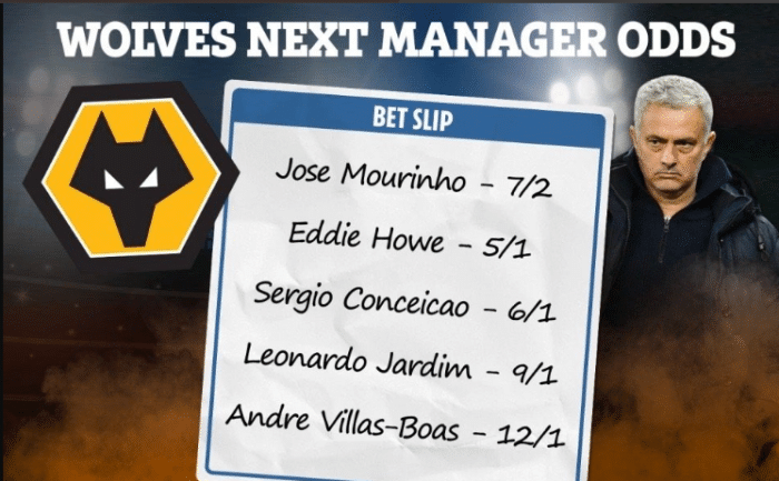 当然,穆里尼奥的球迷更关心穆里尼奥下一站去哪里,而近日英格兰媒体报道,狼队有意邀请穆里尼奥执教了,本赛季努诺带队战绩一般,球队准备赛季末换帅,而他们的头号目标就是穆里尼奥。而目前,英格兰媒体给出的赔率是2赔7,这是一个很低的赔率了,就是不知道穆里尼奥是否会去狼队。