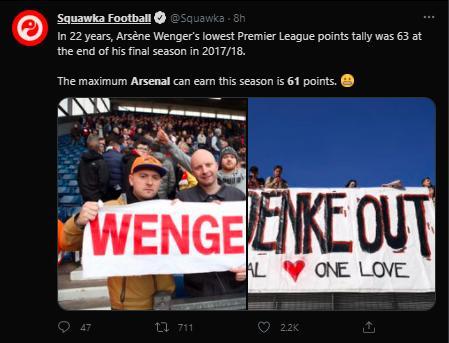 根据Squawka的统计,阿森纳本赛季最多可能拿到61个联赛积分,而温格执教阿森纳22年来的最低联赛积分是2017-18赛季的63分,那也是他执教阿森纳的最后一个赛季。