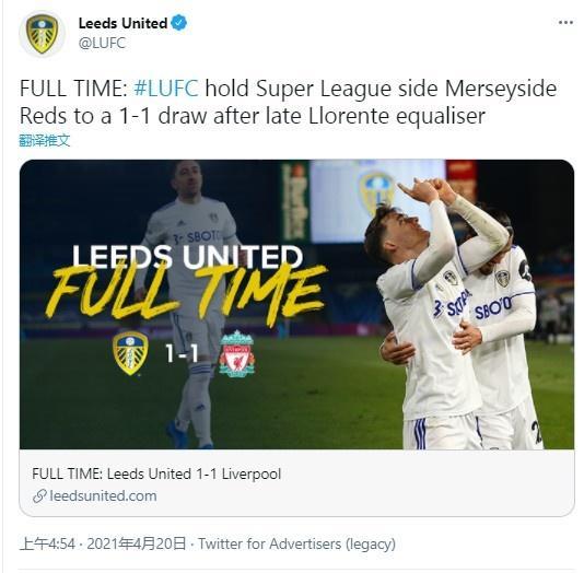利兹联官推写道:“全场比赛结束,略伦特攻入扳平进球,利兹联1-1战平欧洲超级联赛球队默西塞德红队。”