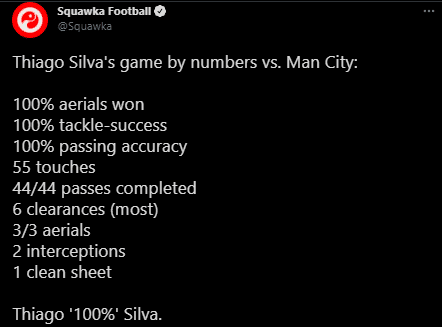 博主还在推特最后补充道:蒂亚戈-百分之百-席尔瓦(Thiago “100%” Silva.)
