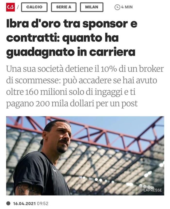 24直播网讯《罗马体育报》近日对伊布生涯目前为止的收入情况进行了分析,其中伊布的收入主要分为年薪收入、赞助费收入两大块。另外,伊布自己还通过开公司、创建个人体育运动品牌等方式获取收入。