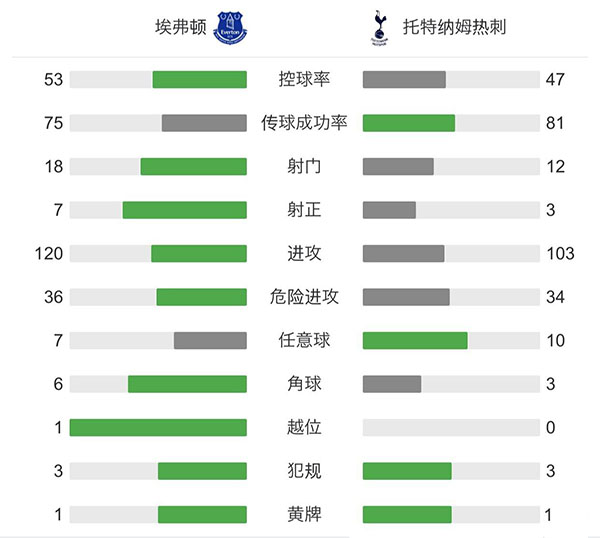 第26分钟,恩东贝莱左路传中,基恩禁区内头球一顶,凯恩停球后凌空扫射入网,埃弗顿0-1热刺!