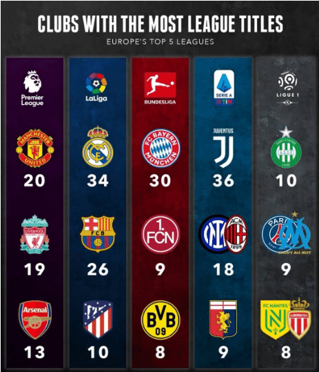 如图,英格兰顶级联赛赛场上上夺得联赛冠军次数最多的是曼联的20次,其次是利物浦的19次,第三是阿森纳的13次。这个排名不会有球迷感到意外,毕竟曼联、利物浦和阿森纳的影响力很大,大家都非常了解他们的历史。而西甲赛场上,夺冠次数最多的是皇马的34次,随后是巴萨的26次,第三是马竞的10次。这个也不会令球迷感到意外,毕竟他们是西甲三强。