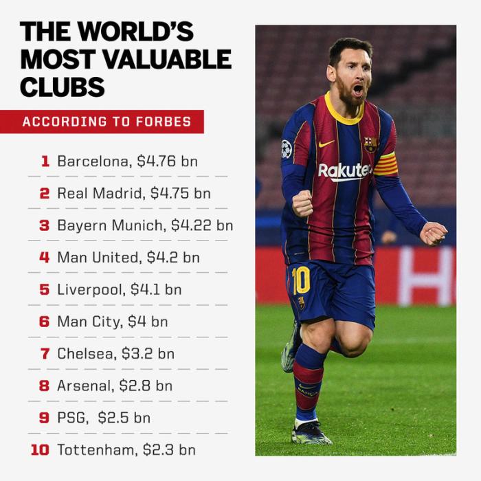 4月13日,《福布斯》发布了全球足球俱乐部市值排行榜 ,巴萨以47.6亿欧元排在榜首,皇马和拜仁分别以47.5亿欧元和42.2亿欧元排在第二和第三,而詹姆斯入股的利物浦以41亿欧元排在了第五。