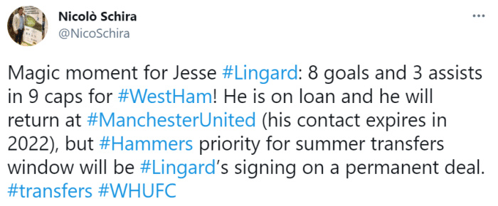 林加德目前的租约将在6月到期,而他与曼联的合同将在2022年6月到期,斯基拉表示,西汉姆今夏的首要目标将会是和曼联谈判买断这名球员。