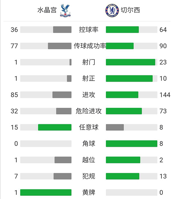 全场比赛结束,切尔西4-1战胜水晶宫。