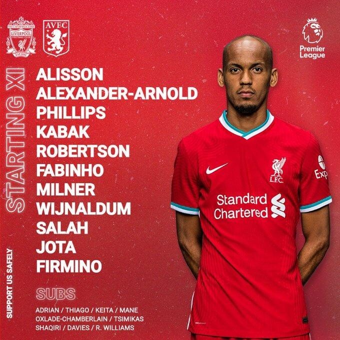 利物浦首发:1-阿利森、66-阿诺德、47-菲利普斯、19-卡巴克、26-罗伯逊、3-法比尼奥、7-米尔纳、5-维纳尔杜姆、9-菲尔米诺、11-萨拉赫、20-若塔