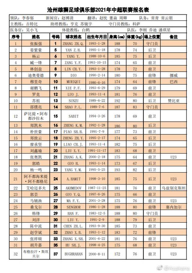 沧州雄狮球员名单: