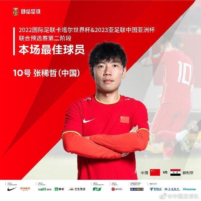 今天凌晨,国足在世预赛40强赛中3-1击败叙利亚,赛后张稀哲被评为全场最佳。