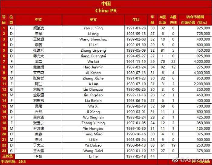 国足战叙利亚23人名单: 武磊、吴曦、艾克森领衔