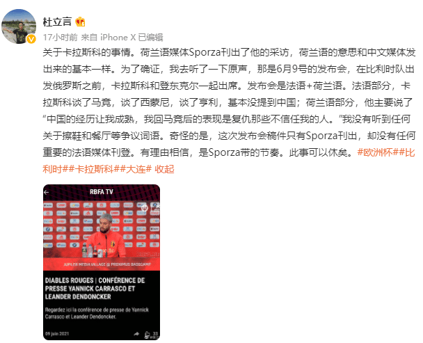 而杜立言表示这些采访内容是杜撰的,他表示:“关于卡拉斯科的事情。荷兰语媒体Sporza刊出了他的采访,荷兰语的意思和中文媒体发出来的基本一样。为了确证,我去听了一下原声,那是6月9号的发布会,在比利时队出发俄罗斯之前,卡拉斯科和登东克尔一起出席。发布会是法语+荷兰语。法语部分,卡拉斯科谈了马竞,谈了西蒙尼,谈了亨利,基本没提到中国;荷兰语部分,他主要说了‘中国的经历让我成熟,我回马竞后的表现是复仇那些不信任我的人。’我没有听到任何关于擦鞋和餐厅等争议词语。奇怪的是,这次发布会稿件只有Sporza刊出,却没有任何重要的法语媒体刊登。有理由相信,是Sporza带的节奏。此事可以休矣。”