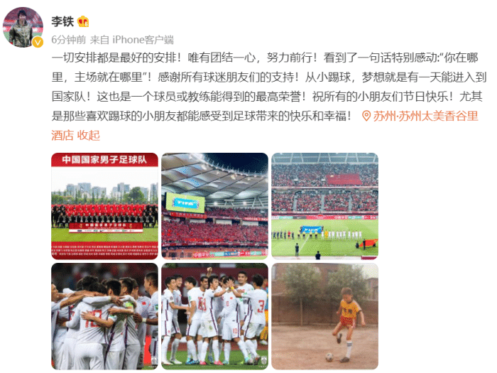 李铁写道:“一切安排都是最好的安排!唯有团结一心,努力前行!看到了一句话特别感动:“你在哪里,主场就在哪里”!感谢所有球迷朋友们的支持!从小踢球,梦想就是有一天能进入到国家队!这也是一个球员或教练能得到的最高荣誉!祝所有的小朋友们节日快乐!尤其是那些喜欢踢球的小朋友都能感受到足球带来的快乐和幸福!”