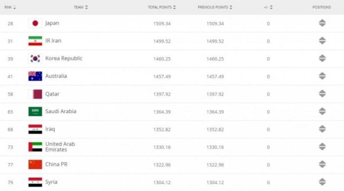 FIFA最新一期排名: 国足亚洲第九, 世界第77